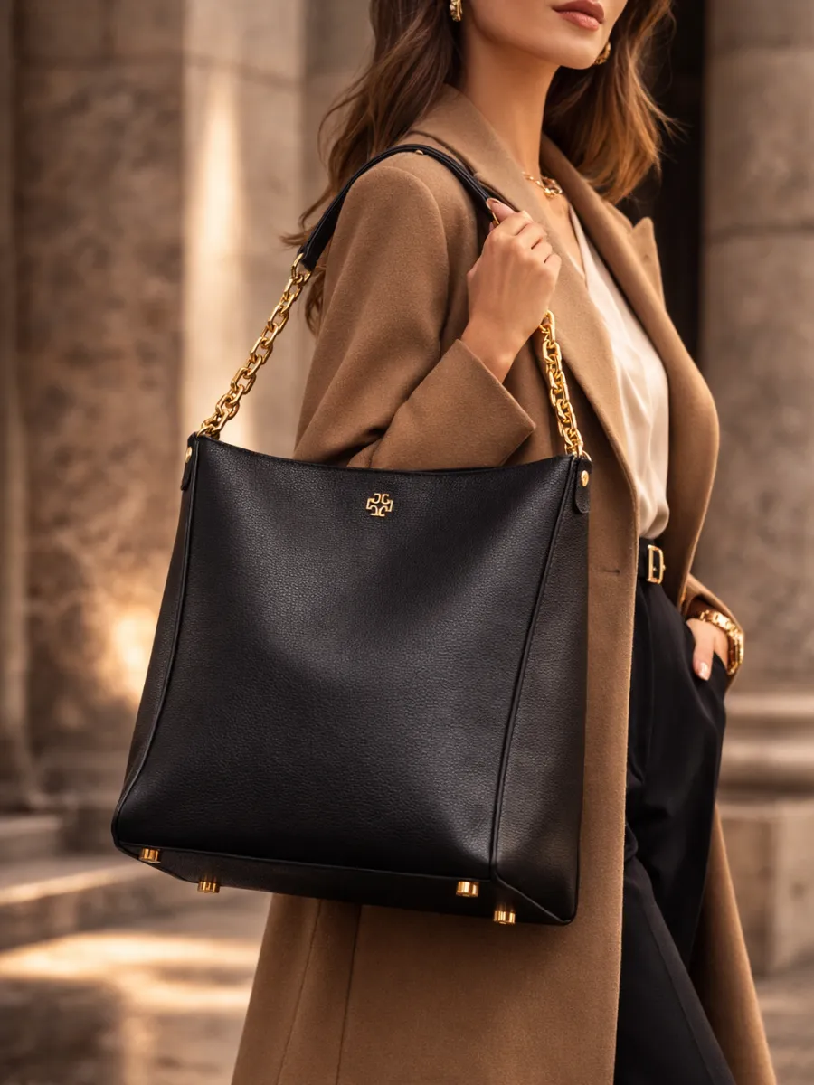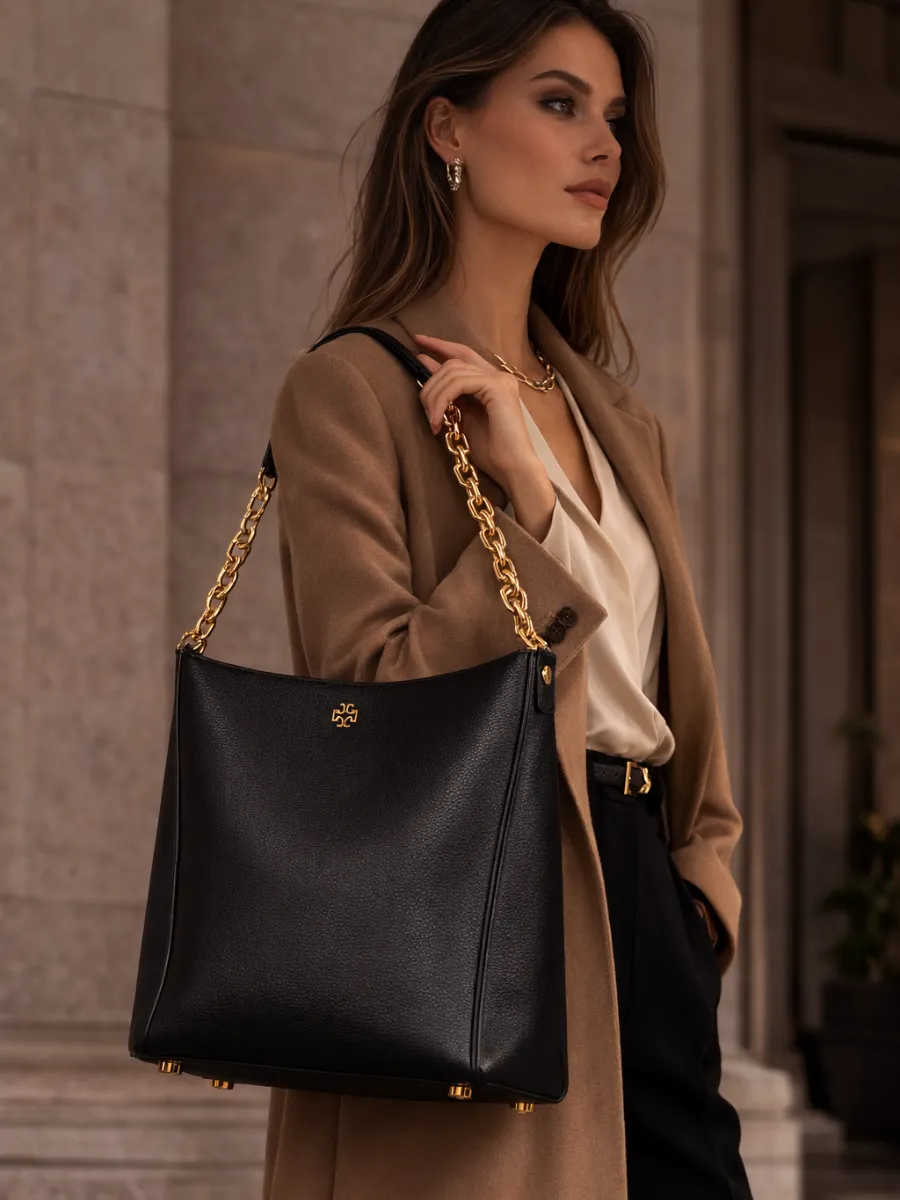 Ana Sayfa Çantalar Lüks Siyah Full-Grain Deri Omuz Çantası Altın Zincir Detaylı