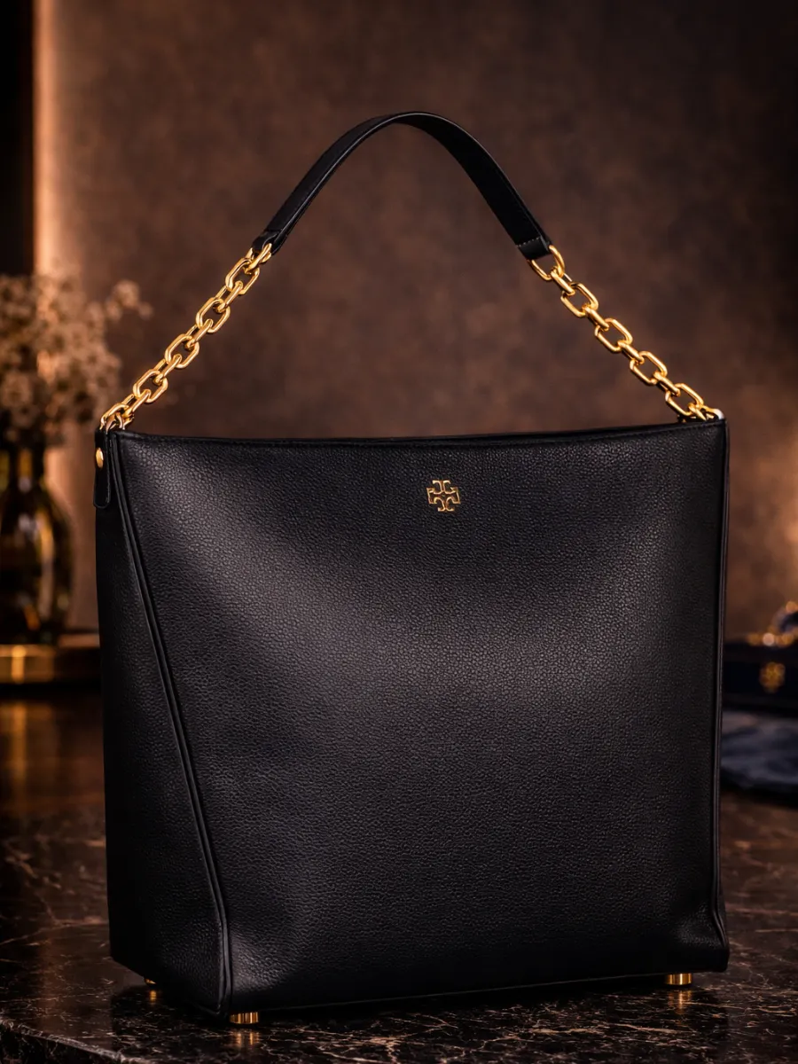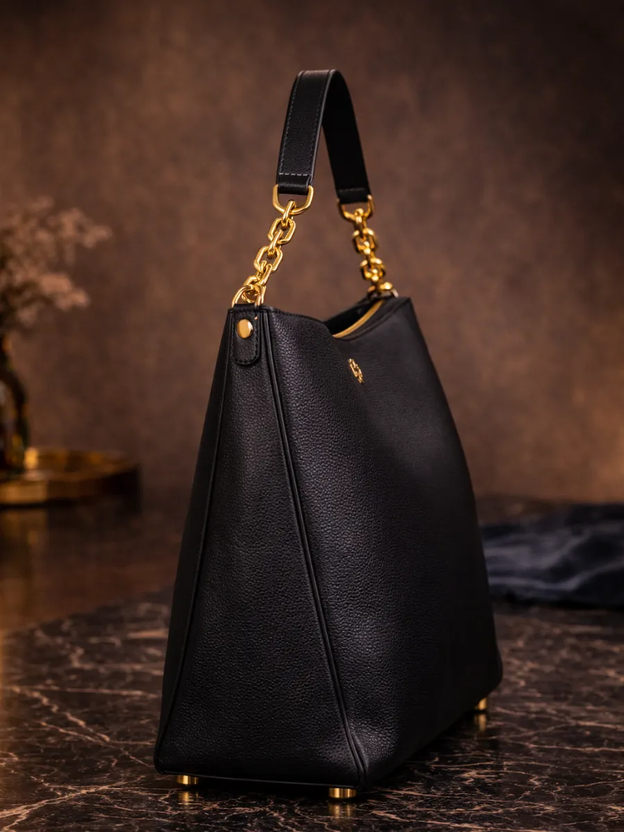 Lüks Siyah Full-Grain Deri Omuz Çantası Altın Zincir Detaylı