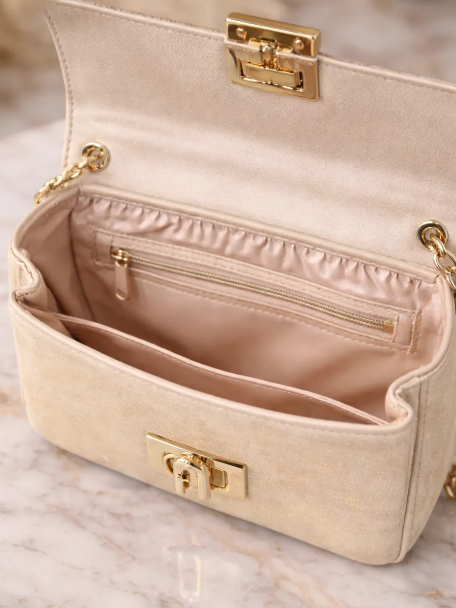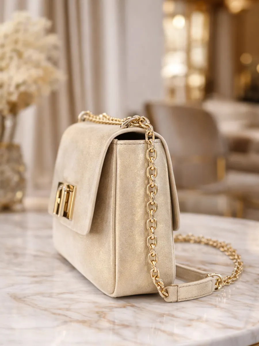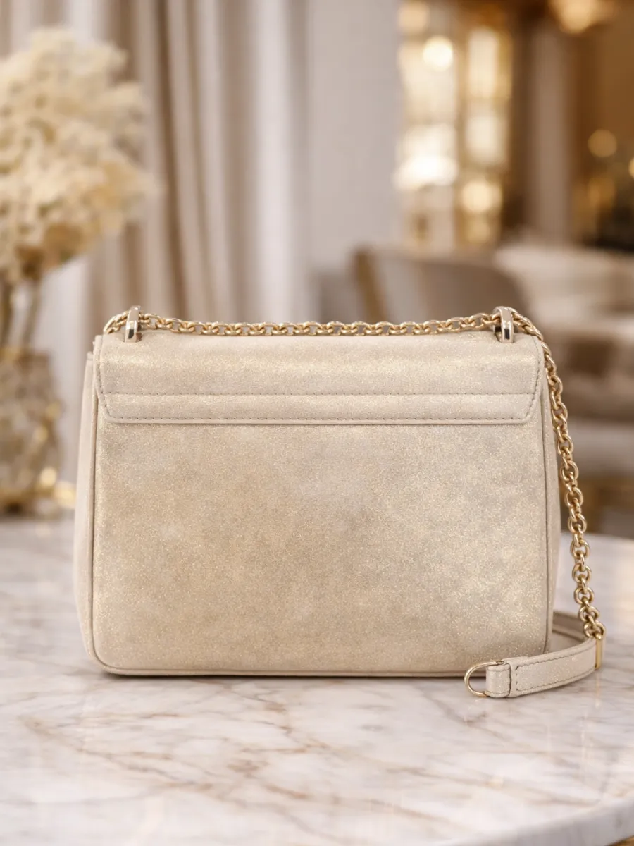 This elegant champagne cream women's shoulder bag is designed to enhance your evening and special occasion outfits. Its subtle glossy texture and refined gold metal lock create a luxurious and sophisticated appearance. The gold chain strap adds a modern touch while offering versatile carrying options. You can comfortably wear it on your shoulder or as a crossbody bag. Despite its compact size, it provides enough space for your essentials such as phone, cards, and small accessories. The interior zip pocket ensures organized storage. Perfect for parties, dinners, and formal events, this stylish bag is an essential accessory for women who value elegance and practicality. • Premium glossy finish • Elegant gold metal lock • Gold chain strap • Compact and lightweight • Interior zip pocket • Ideal for evening and special occasions • Stylish and refined design • Shoulder and crossbody use