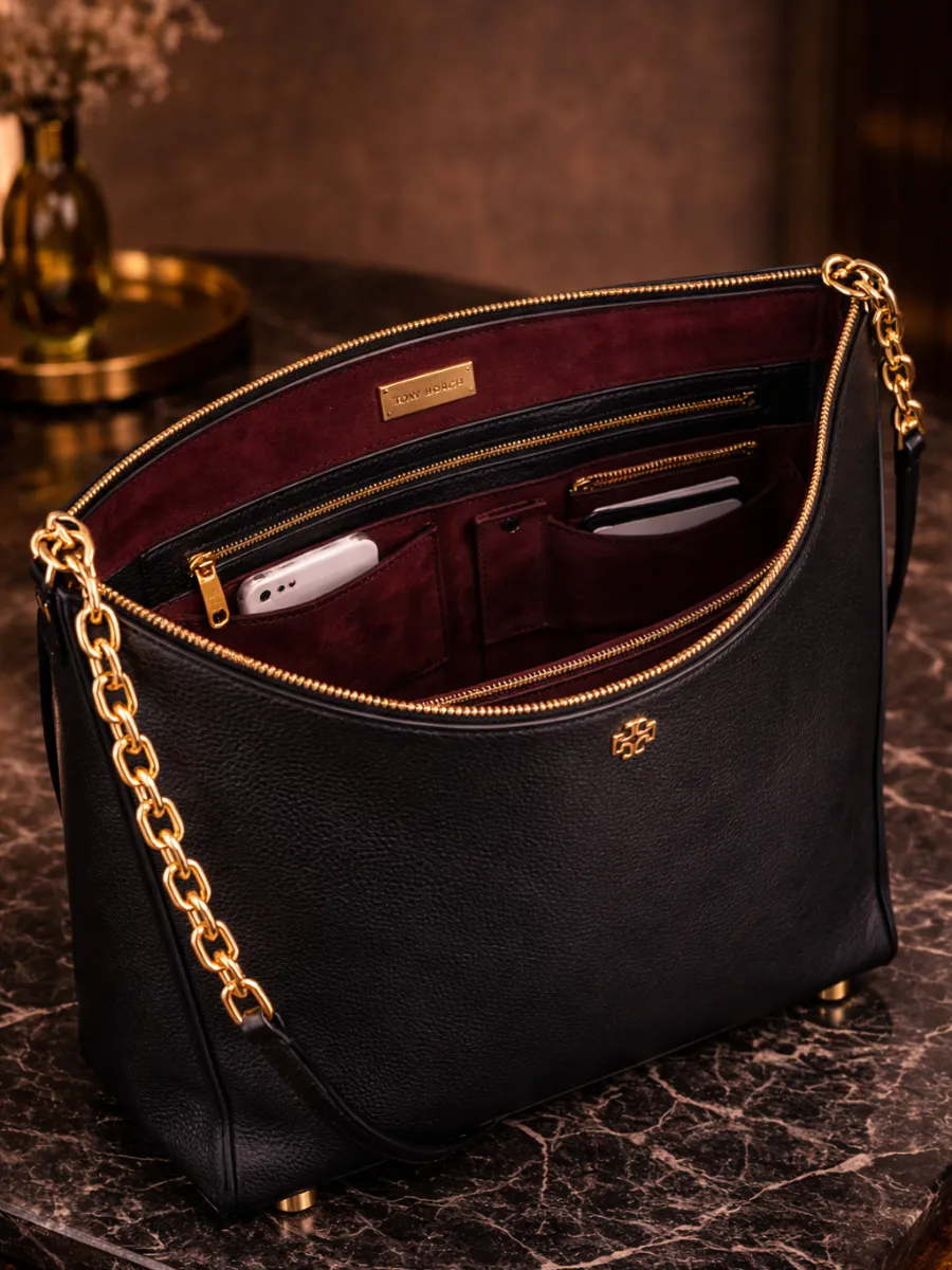 Ana Sayfa Çantalar Lüks Siyah Full-Grain Deri Omuz Çantası Altın Zincir Detaylı