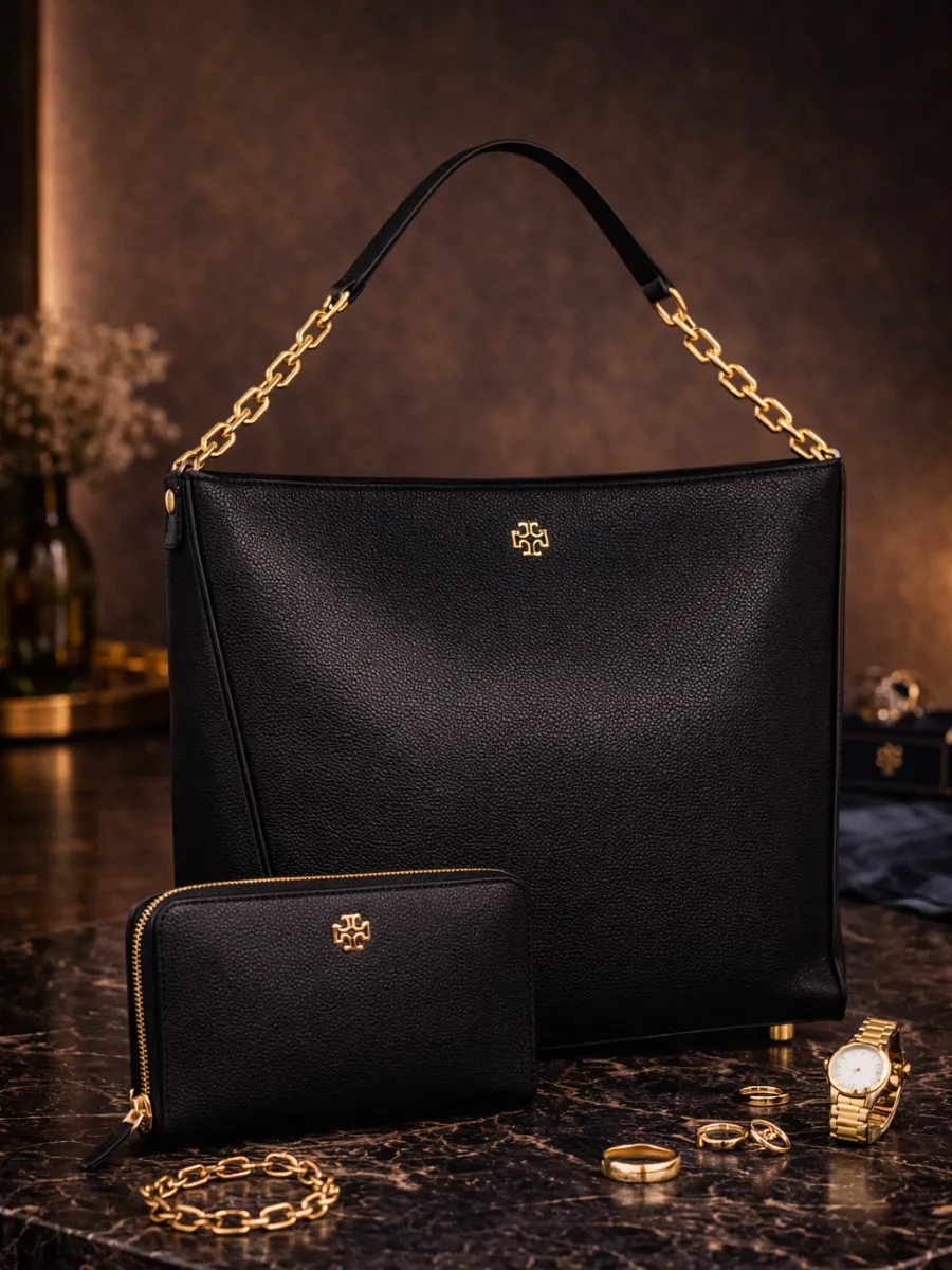 Lüks Siyah Full-Grain Deri Omuz Çantası Altın Zincir Detaylı